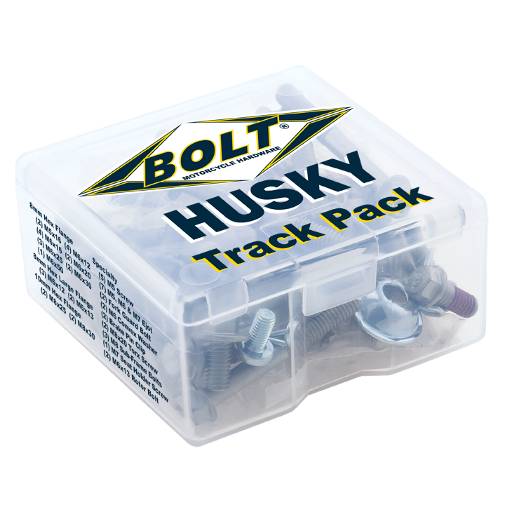 Our new 52 piece Husky Track Pack has been designed for Husqvarna two- & four-stroke models and contains essential hardware in factory style and finish including: M5, M6 and M8 torx head flange bolts, shroud screws, seat bolts, fork guard bolts, fender and side cover fasteners, case cover bolts, motor mount hardware, brake pin clips, concave washers, sub-frame bolts.